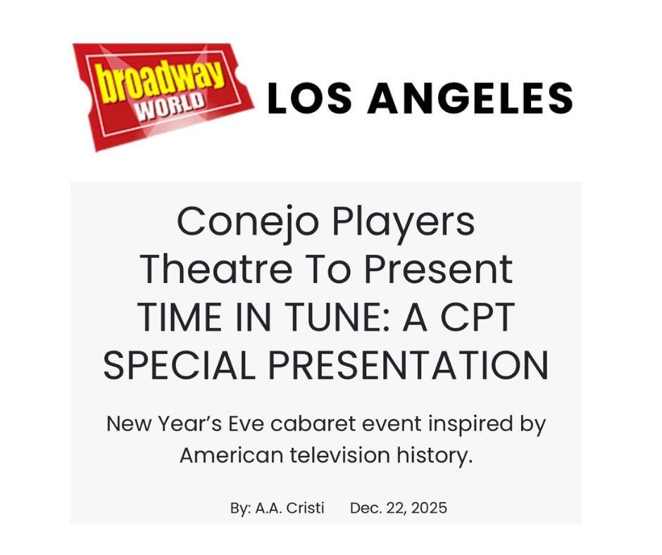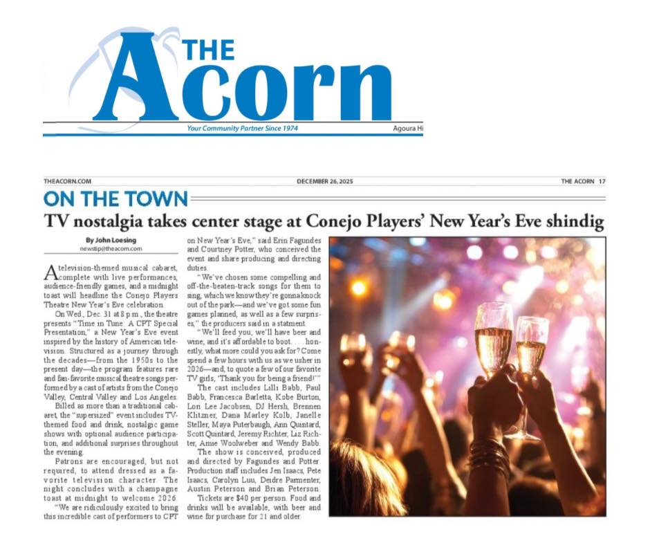 “Conejo Players Theatre will present Time in Tune: A CPT Special Presentation, a New Year’s Eve cabaret-style event drawing inspiration from the history of American television. The program traces television eras from the 1950s to the present through musical theatre selections performed by artists from the Conejo Valley, Central Valley, and Los Angeles.”