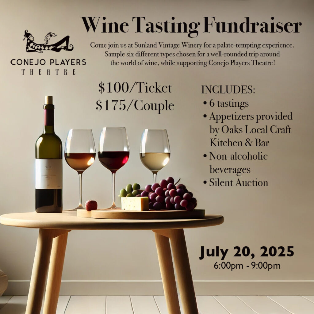 Come join us at Sunland Vintage Winery for a palate-tempting experience. Sample six different types chosen for a well-rounded trip around the world of wine, while supporting Conejo Players Theatre! Includes 6 tastings, Appetizers provided by Oaks Local Craft Kitchen & Bar and Flour And Flourish, Non-alcoholic beverages, and Silent Auction!
