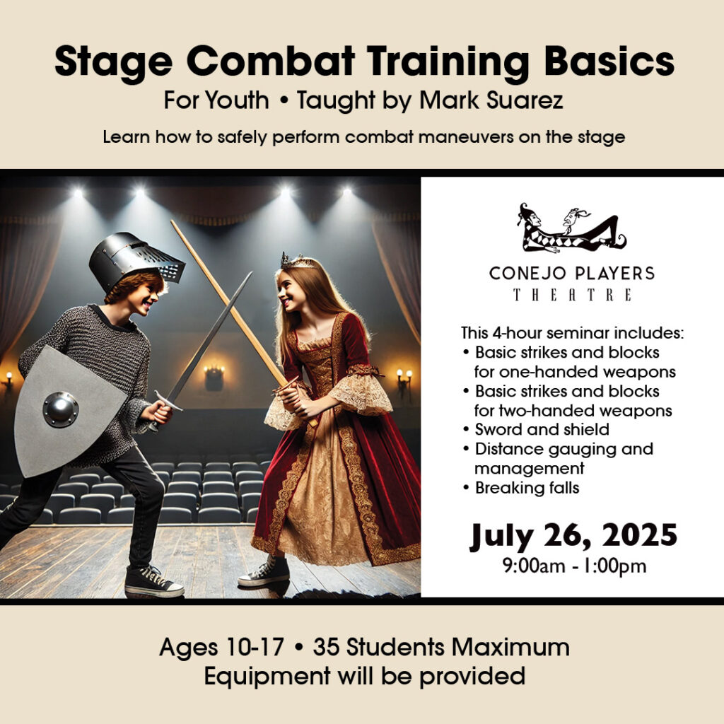 Kids 10 – 17 are invited to join us for stage combat training basics for youth. The workshop is being taught by Mark Suarez. Click here to sign up! This workshop is limited to 35.