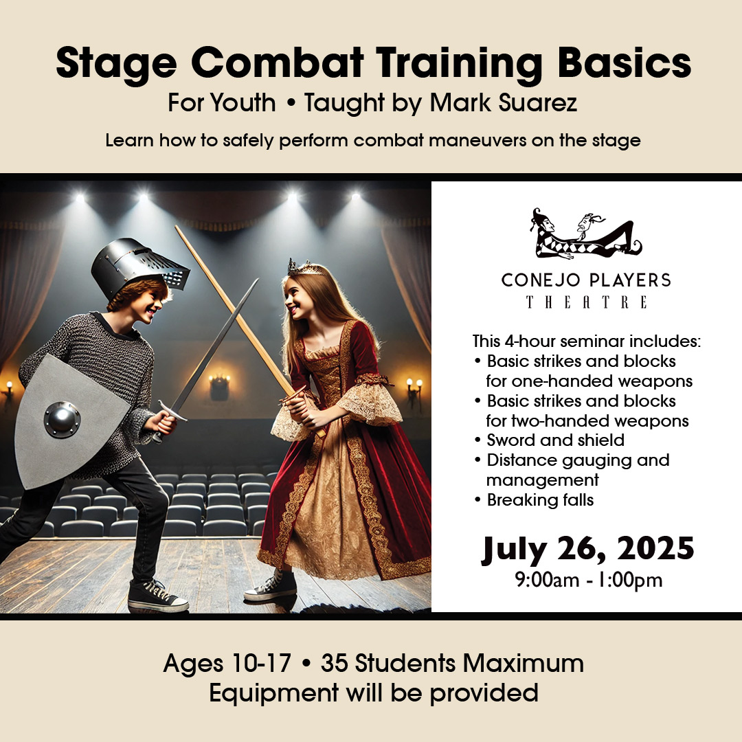 Youth Stage Combat Training Basics Youth Stage Combat Training Basics July 26, 2025 at 9:00am About Kids 10 – 17 were invited to join us for stage combat training basics for youth. The workshop was taught by Mark Suarez (limited to 35 participants).Â