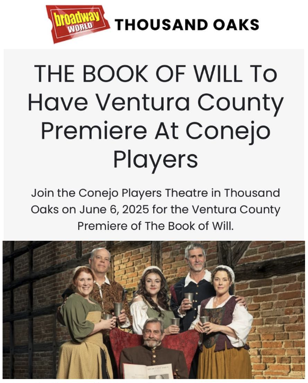 “Conejo Players Theatre will present Ventura Country Premiere of the historical dramatic comedy, The Book of Will. Told with great humor and accessibility, The Book of Will celebrates the Theater, and the power and legacy of great art.”