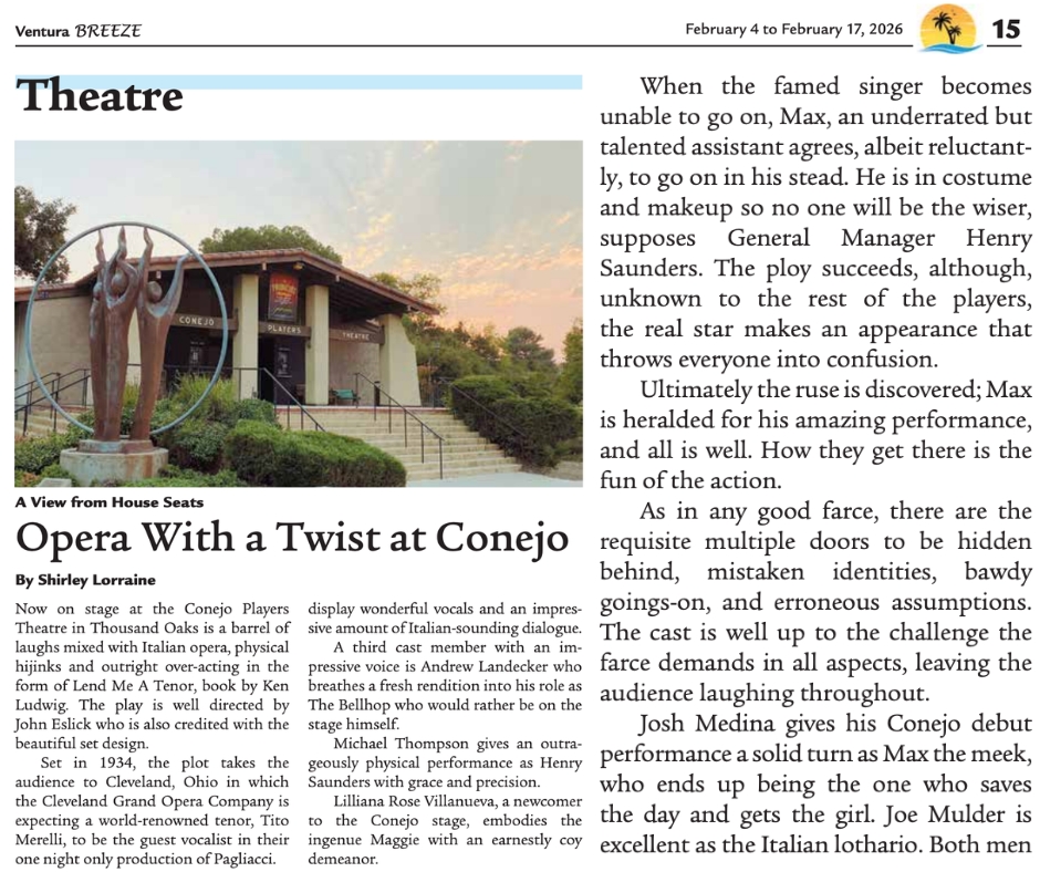 Ventura Breeze gives the play a very positive review; “Now on stage at the Conejo Players Theatre in Thousand Oaks is a barrel of laughs mixed with Italian opera, physical hijinks… The play is well directed by John Eslick who is also credited with the beautiful set design.”