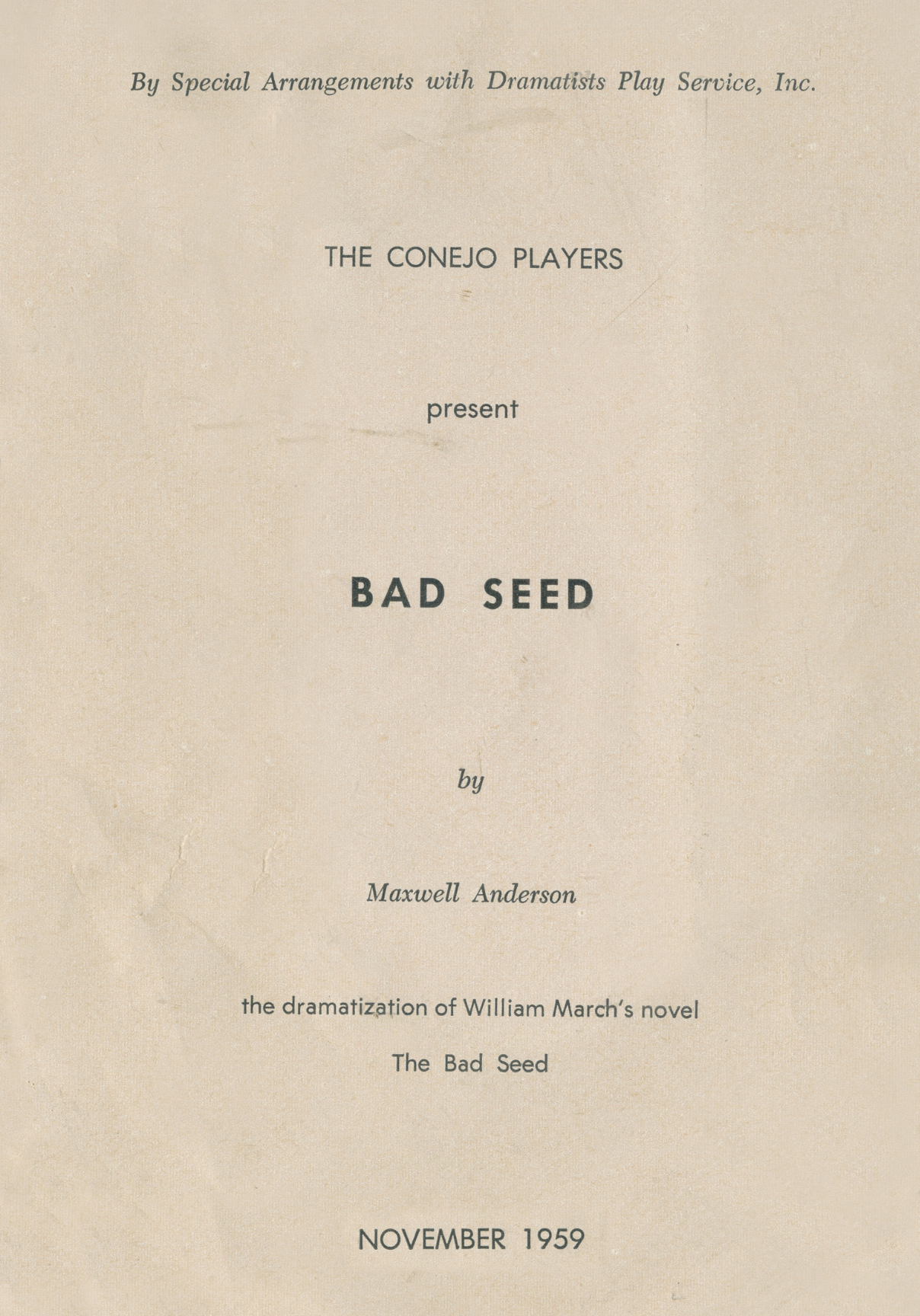 Show TimesNovember 1959About the showPresented through special arrangement with Dramatists Play Service, Inc.Directed by: Bill Adams Produced by: Conejo Players Follows the chilling story of Rhoda Penmark, a young girl with a dark, psychopathic streak, and her mother’s gradual realization of her daughter’s true nature after a classmate’s death. Written by Maxwell Anderson, a dramatization of William March’s novel. |