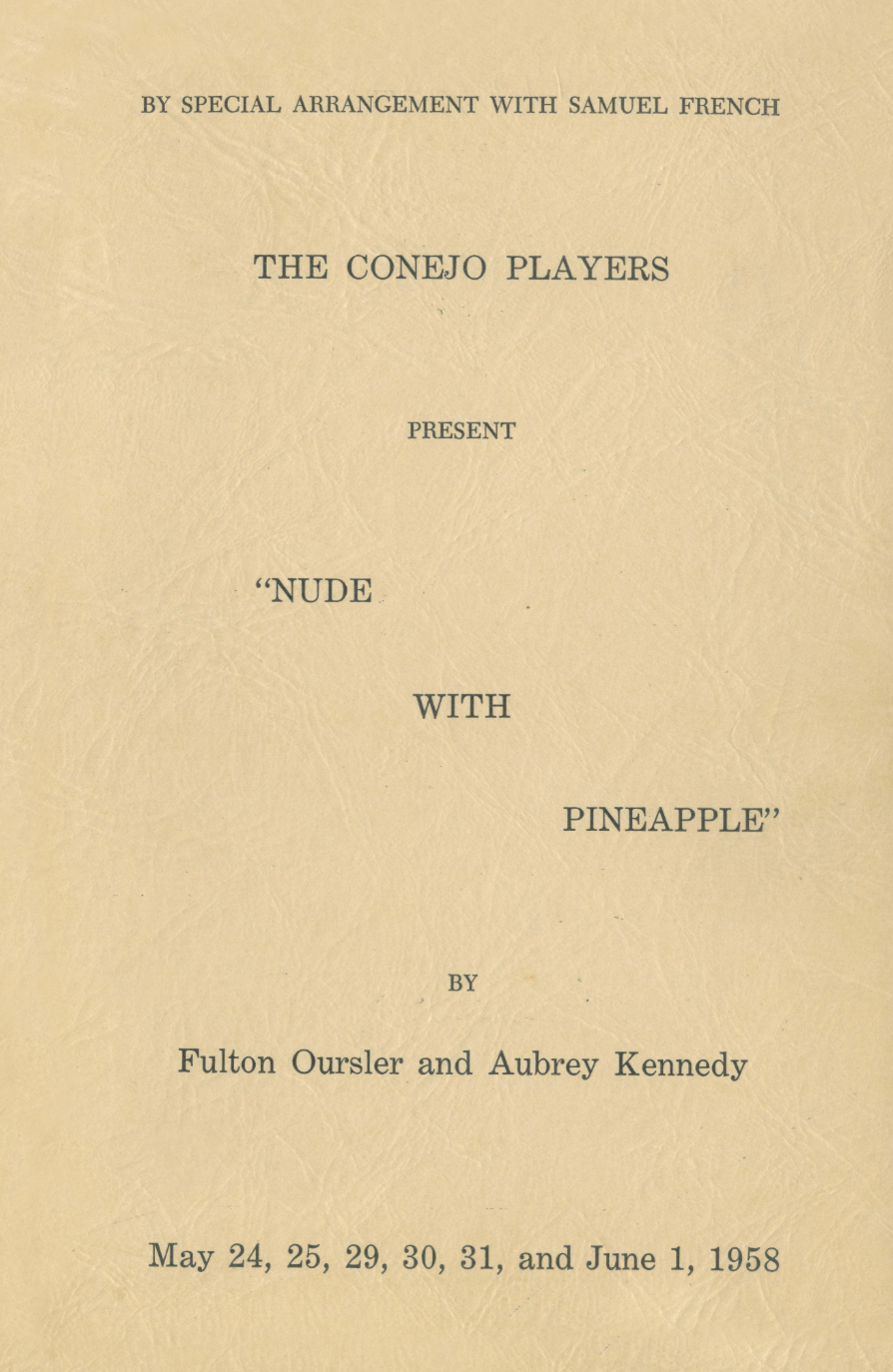 Show TimesMay 24 - June 1, 1958About the showPresented through special arrangement with Samuel FrenchDirected by: Dwight Hauser Produced by: Conejo Players “Nude with Pineapple” by Fulton Oursler and Aubrey Kennedy, is loosely based on Oursler’s book “Behold This Dreamer.” Director Dwight Hauser negotiated with Samuel French for permission to use the catchier title, which is based on a painting within the story. The story of a young man, a dreamer, who soars to higher fields than those into which he has been thrown, who has married a prosaic wife, who is one of a painfully prosaic family. They watch him, decide he is crazy and place him in a private sanitarium. It must be admitted that he offers very little objection to this idea. It is while in this institution that many of the screamingly funny situations of the play take place. From start to finish the comedy is filled with brilliant dialogue and plenty of satire and irony. |