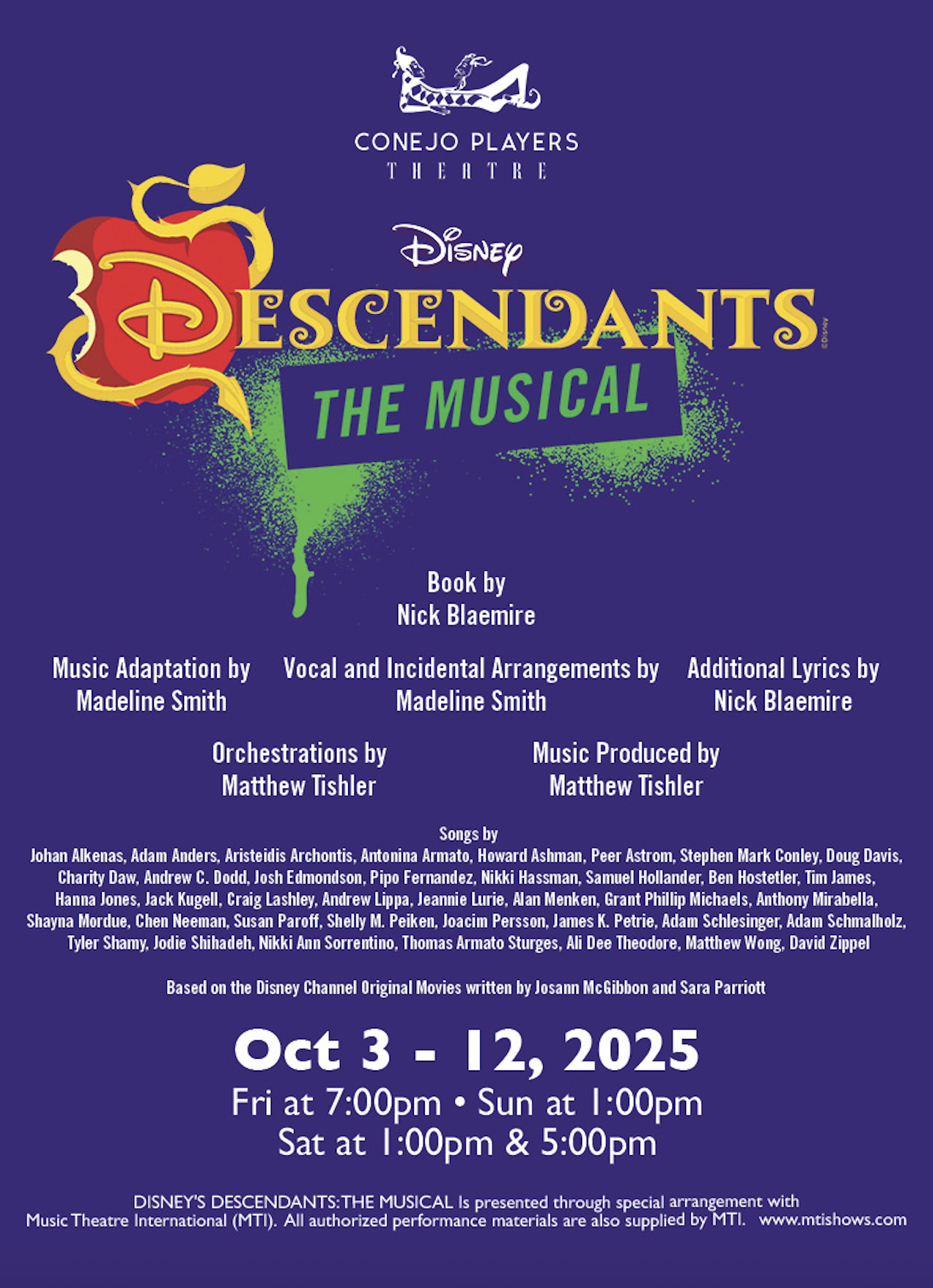We are happy to announce that we will be hosting a sensory-friendly performance of Descendants on Sunday, October 5, 2025 at 9:30am. Sensory-friendly performances are adapted to be more welcoming and comfortable for our audience members with sensory sensitivities. Conejo Players Theatre is taking these steps to make the theatre going experience more accessible: