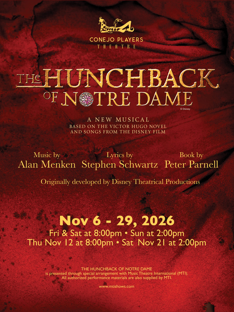 The story begins as the bells of Notre Dame sound through the famed cathedral in fifteenth-century Paris. Quasimodo, the deformed bell-ringer who longs to be “Out There,” observes all of Paris reveling in the Feast of Fools. Held captive by his devious caretaker, the archdeacon Dom Claude Frollo, he escapes for the day and joins the boisterous crowd, only to be treated cruelly by all but the beautiful Esmeralda. Quasimodo isn’t the only one captivated by her free spirit, the handsome Captain Phoebus and Frollo are equally enthralled. As the three vie for her attention, Frollo embarks on a mission to destroy the Roma and it’s up to Quasimodo to save them all.