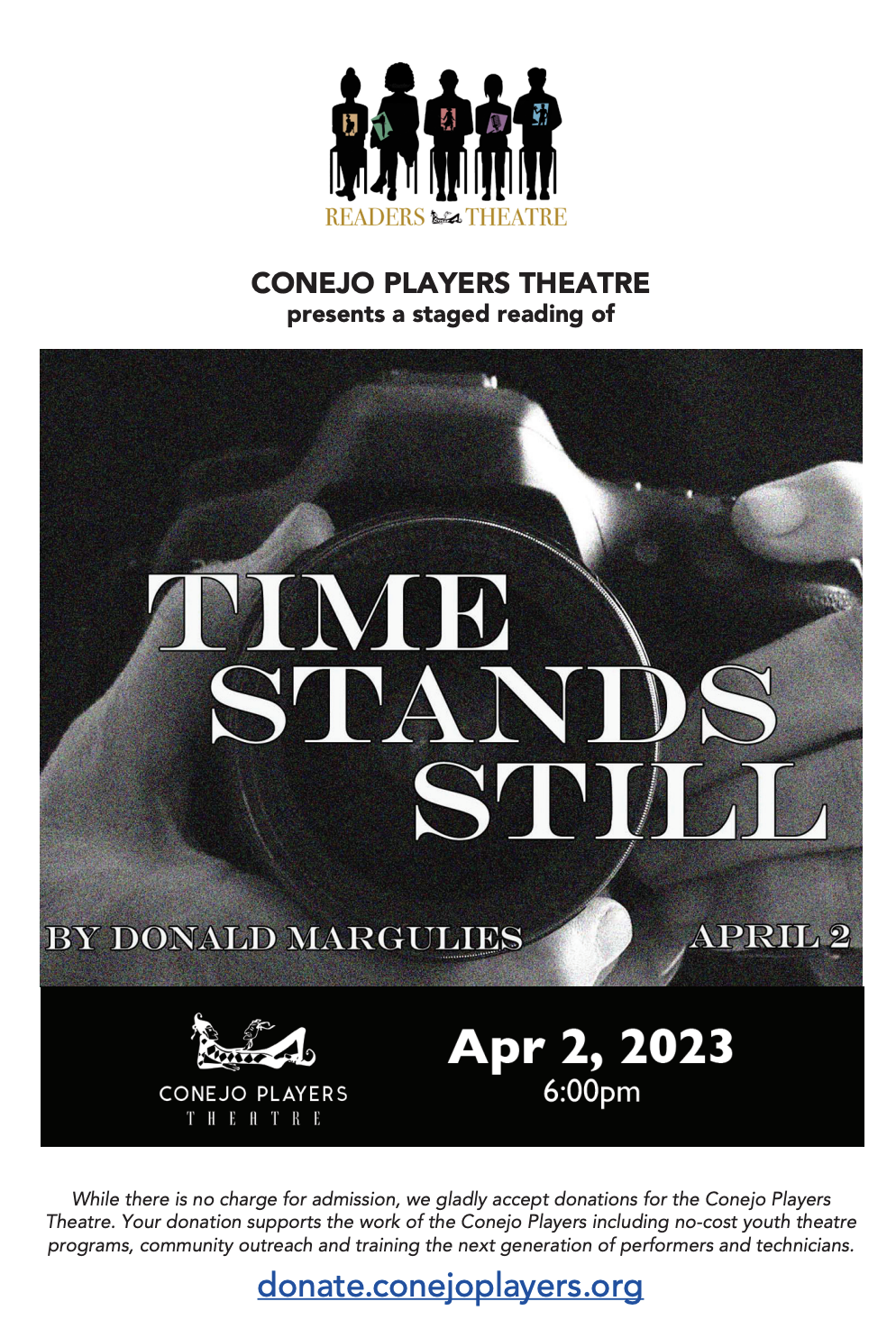 Show TimesApril 2, 2023 – 6pm About the showPresented through special arrangement with Dramatists Play ServiceDirected by: Paul Babb Produced by: Scott Quintard & Paul Babb Mature audiences – Adult themes and language Time Stands Still follows the story of a photojournalist and a foreign correspondent who must confront the complexities of their relationship and the effects of their work on their lives and those around them. The play is set in Brooklyn and revolves around Sarah, a photo journalist who has returned from covering the Iraq war after being injured by a roadside bomb, and her reporter boyfriend James who is besieged with guilt after leaving Sarah alone in Iraq. They receive a visit from their friend Richard, a photo editor, who introduces them to his new girlfriend Mandy. Their burgeoning relationship makes James and Sarah examine their own relationship and way of life. Is it possible for two people who are used to living in dangerous conditions to carve out a normal life? Can they stay together amidst unspoken betrayals and conflicting ideals? What is the role of media in life and death when breaking news unfolds. This staged reading of Donald Margulies powerful and thought-provoking script promises to be a one-of-a-kind theatre experience that will leave you thinking long after the final act. Readers Theatre offers a unique theatrical experience – a staged reading in which actors present a play or musical in front of an audience without sets, costumes or other production elements. The actors are not off-book, which means they typically have the script in hand while they perform. It allows the audience to focus on the story and the characters. Attendance is free of charge – but CPT donations are welcome. |
